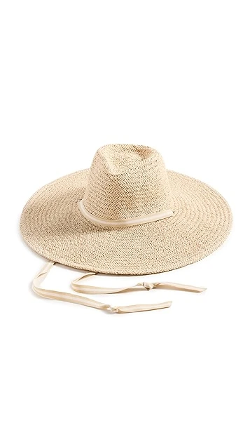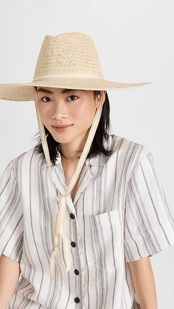 A striped grosgrain band forms the chin strap of this wide-brimmed Hat Attack sun hat, which is woven from fine, light-colored straw for a summery feel.