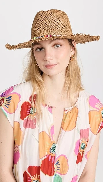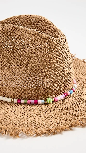 A Hat Attack straw hat that leans into a fun and summery feel, thanks to a frayed brim and a beaded band around the crown.