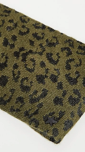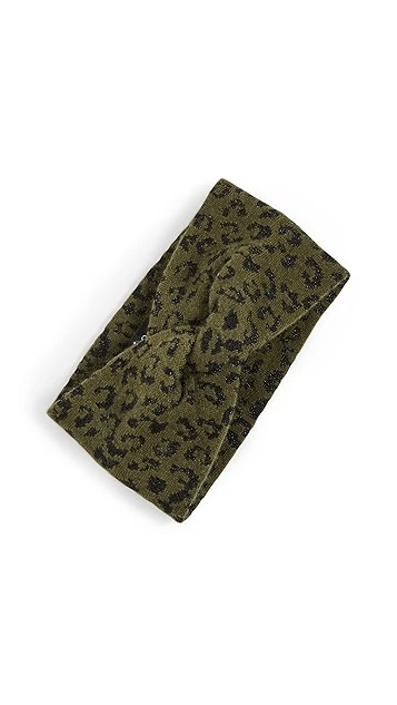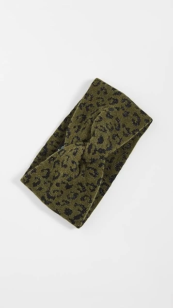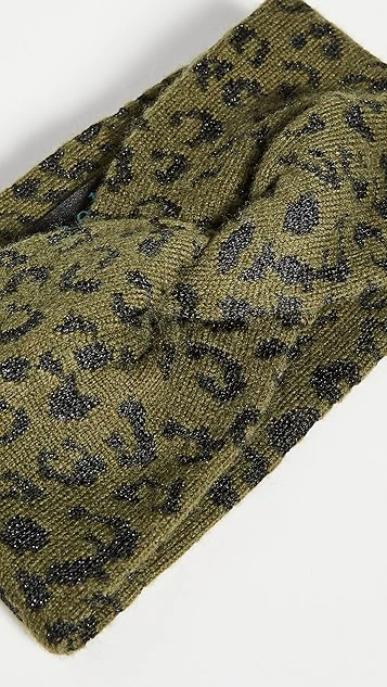A soft Jocelyn headband in a twisted silhouette, accented with a leopard motif and a subtle metallic sheen.