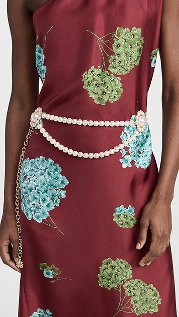 A double-layered Lele Sadoughi belt that’ll add a touch of elegance to any look, featuring a mix of imitation pearls and gold-tone links.