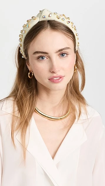 This Lele Sadoughi knotted headband is rendered in neutrally colored twill, and gains a touch of extra eye-catching style from a collection of iridescent crystals.