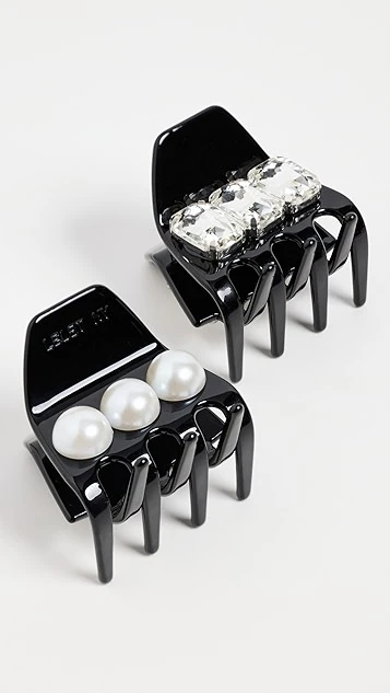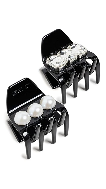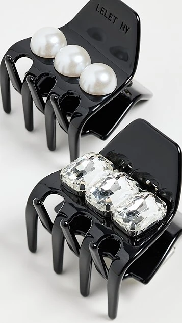 A pair of premium hair clips from LELET NY in black acrylic, featuring prominent crystal and imitation pearl baubles.